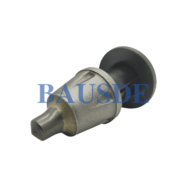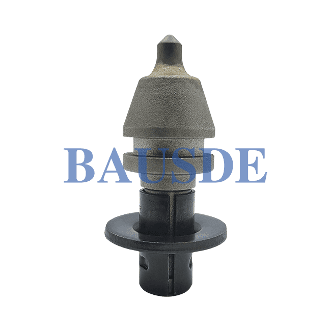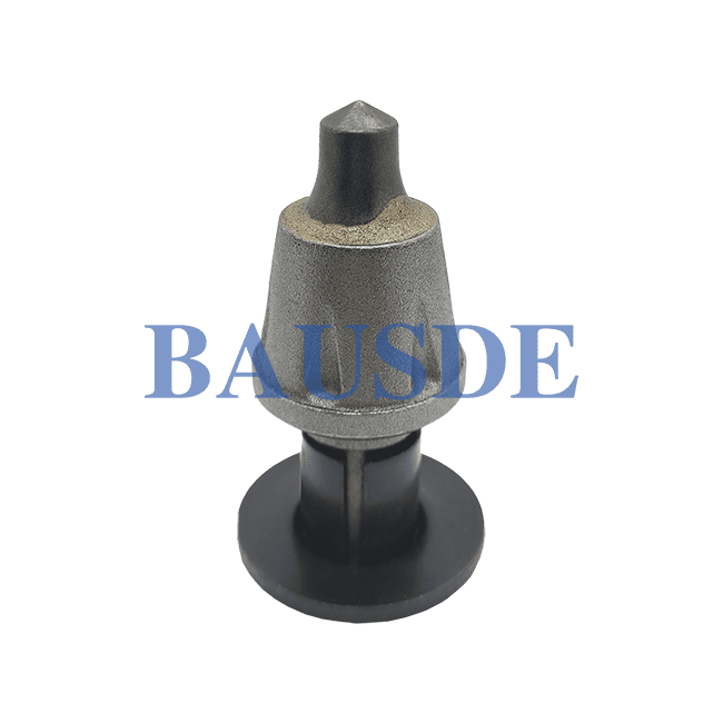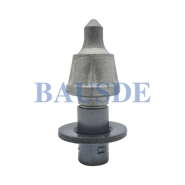 BAUSDE offers all kinds of round shank picks for medium-size and large-size road milling machines, for removing asphalt pavements. This tool is equipped with a cap-shaped tungsten carbide tip, alloy steel body, wear plates, clamping sleeve.