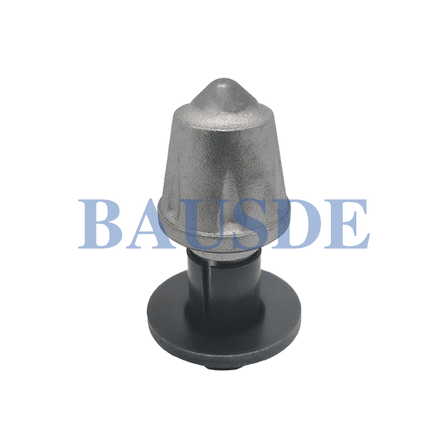 BAUSDE offers all kinds of round shank picks for medium-size and large-size road milling machines, for removing asphalt pavements. This tool is equipped with a cap-shaped tungsten carbide tip, alloy steel body, wear plates, clamping sleeve.