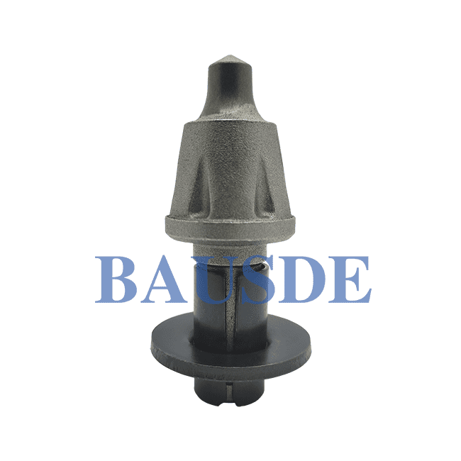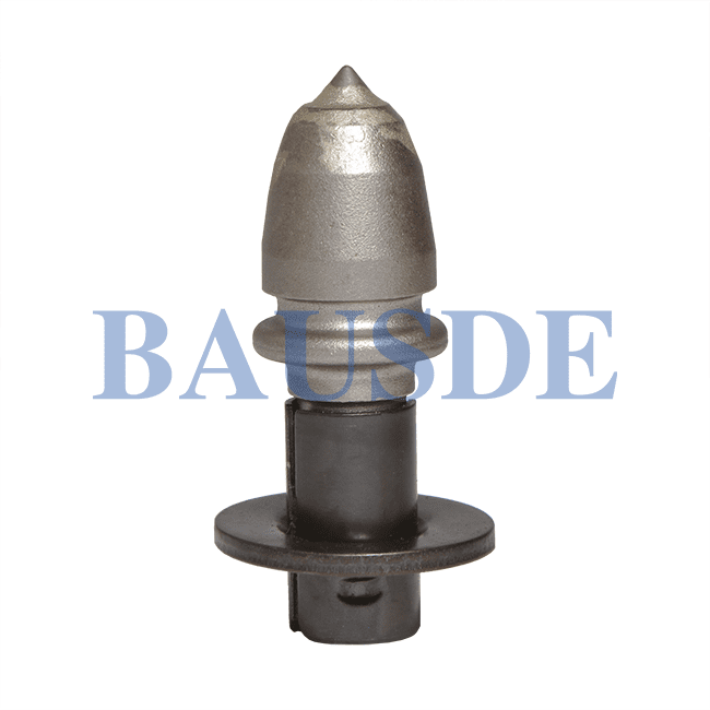 BAUSDE offers all kinds of round shank picks for medium-size and large-size road milling machines, for removing asphalt pavements. This tool is equipped with a cap-shaped tungsten carbide tip, alloy steel body, wear plates, clamping sleeve.